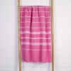 Die schönen fuchsia gestreiften Hamamtücher von Ottomania sind aus hydrophiler Baumwolle. Sie nehmen sehr leicht Feuchtigkeit auf, trocken wiederum schnell. Man kann sie gut waschen. Trotz seiner Größe ist das aufgefaltete Tuch sehr kompakt und wiegt nur 250 Gramm. Daher ist es ideal für den Transport im Koffer, Rucksack oder in der Strandtasche. Nimm es mit auf Reisen zum Strand, auf dein Boot, ins Schwimmbad, in die Sauna oder zum Sport. Auch für die Babypflege eignen sich die Hamamtücher ausgezeichnet. Man kann diese Tücher nicht nur zum Abtrocknen im Badezimmer, sondern auch als Unterlaken oder als Sommerdecke im Babybett schön einsetzen. Sie sind auch ideal, um das Kind beim Stillen einzuwickeln und so ein sehr schönes und praktisches Geburtsgeschenk. All unsere Hamamtücher sind handgewebt. Hierdurch gibt es Unterschiede in der Farbe. Auch kleine Webfehler sind möglich und gehören zum Produkt.